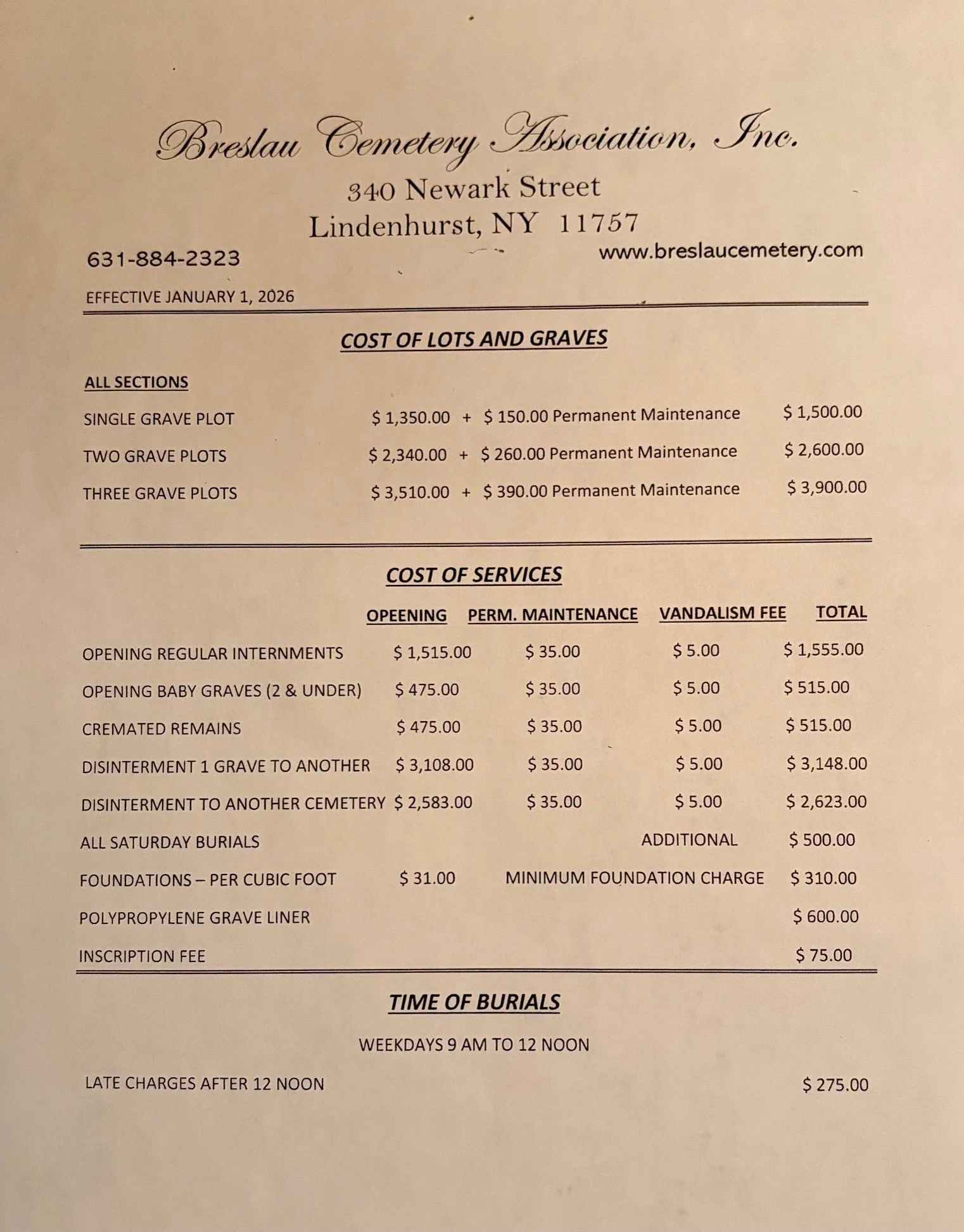 If you are interested in purchasing a plot at Breslau Cemetery it is by appointment only. We can be reached at 631-884-2323